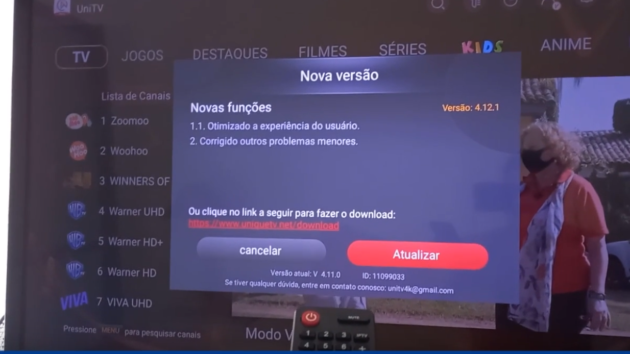 A atualização do seu aplicativo UniTV é gerada de forma automática. Assim, quando uma nova atualização estiver disponível, ela vai aparecer na sua tela inicial.